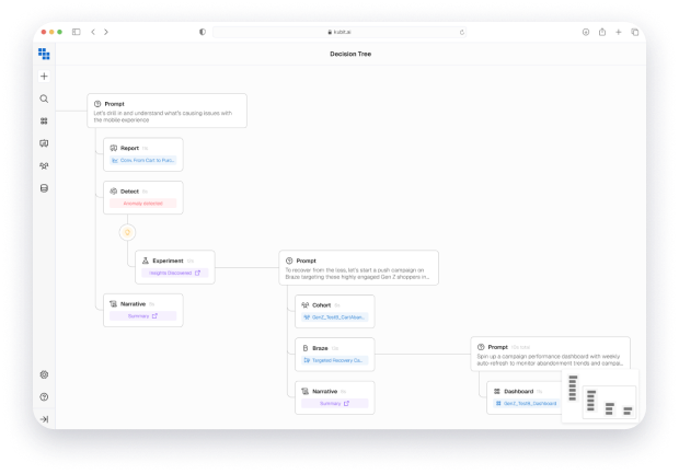When metrics shift, Kubit doesn’t wait for you to ask. Investigation Agents launch root-cause analyses automatically, showing their work through interactive decision trees.