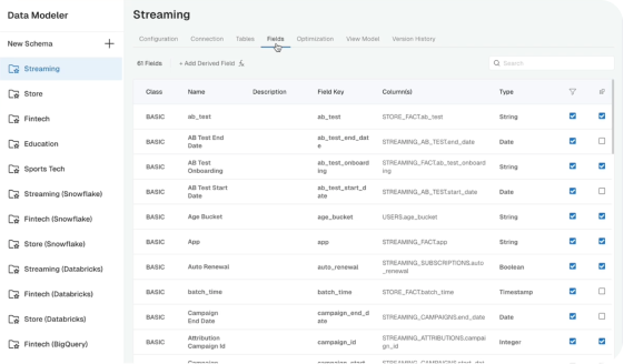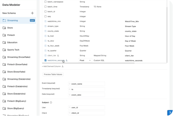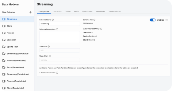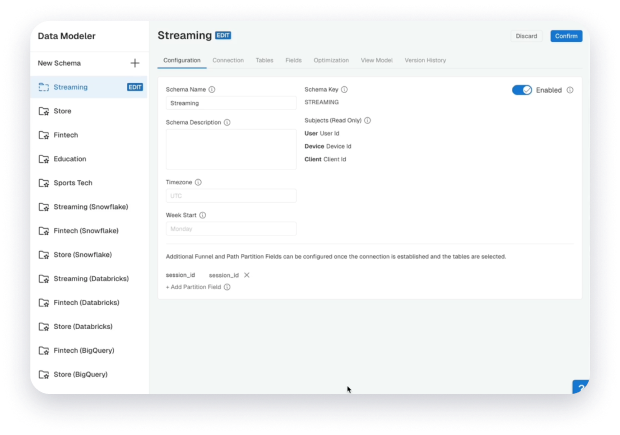 Easily create or update schemas, align them to business logic, and configure reporting preferences such as time zones or weekly rollups.