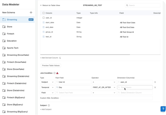 Add dimension tables, create derived columns, and adjust join conditions on the fly. Adapt your data model to match business needs without heavy engineering support.