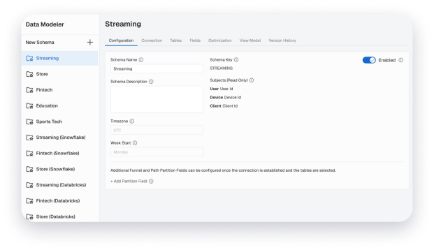 Support for multi-schema environments allows raw and clean data to coexist. Updates to dimensions apply across historical data automatically, without backfills. Combine operational and clickstream events seamlessly for a unified view.