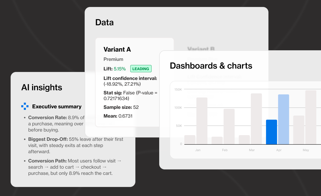 Use rapid, instantly verifiable insights to build better products. Self-service exploration and AI agents help you quickly uncover user needs, investigate anomalies, and prioritize improvements.